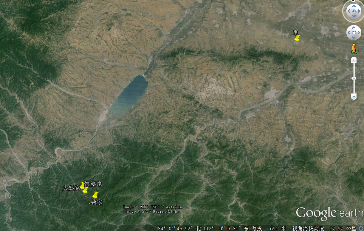打开google earth,可以看到那边地处秦岭山脉末端,向西南是无边无际的大山,那种感觉无法描述,当你走进深山手机没有信号没有网络看看这边一户那边一家土房的时候就切实的体会到了大山中人生活的不易,心酸无奈,真庆幸我姥姥当初走出来,不然的话我依然是我,只是不可能在这样的网站上写博客发感慨了,有的可能就是无知了。